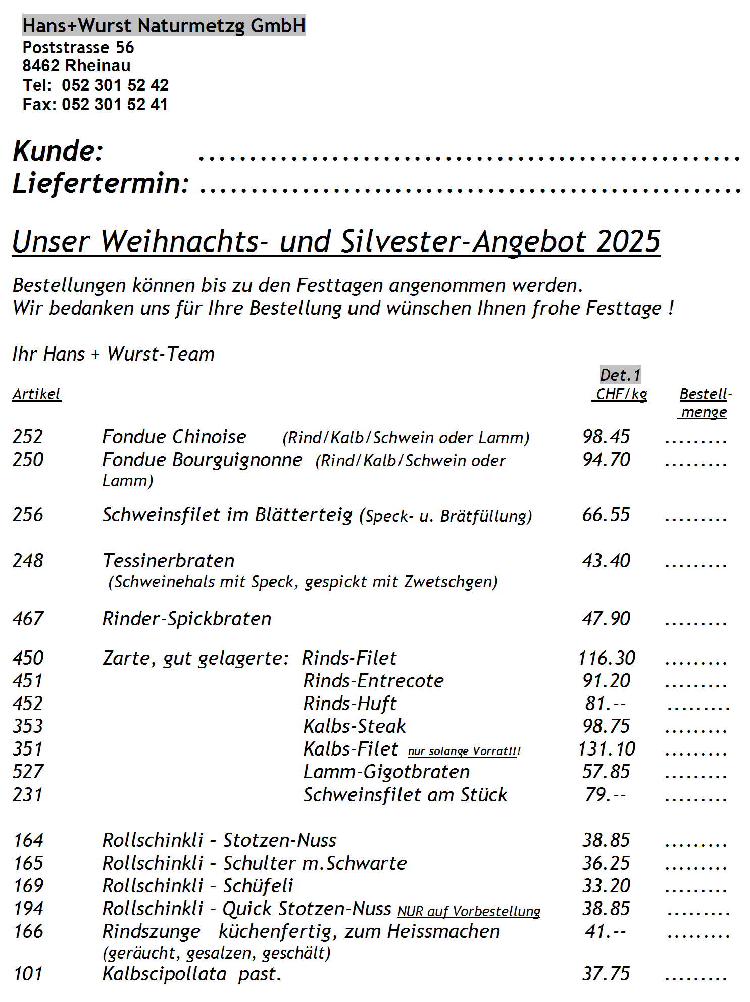 In der Weihnachts- und Neujahrswoche beliefern wir sie jeweils am Mittwoch 24.12. und 31.12. statt am Freitag, Bestellschluss ist jeweils am Dienstag bis spätestens 9 Uhr!